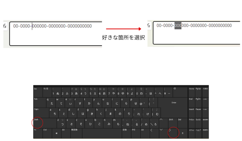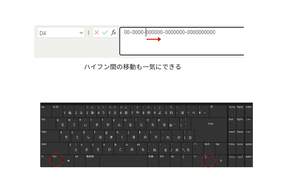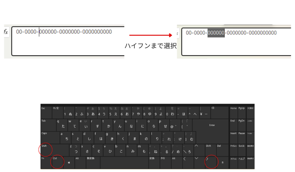 また、郵便番号など「-(ハイフン)」で囲まれた文字列にもショートカットキーが利用できます。