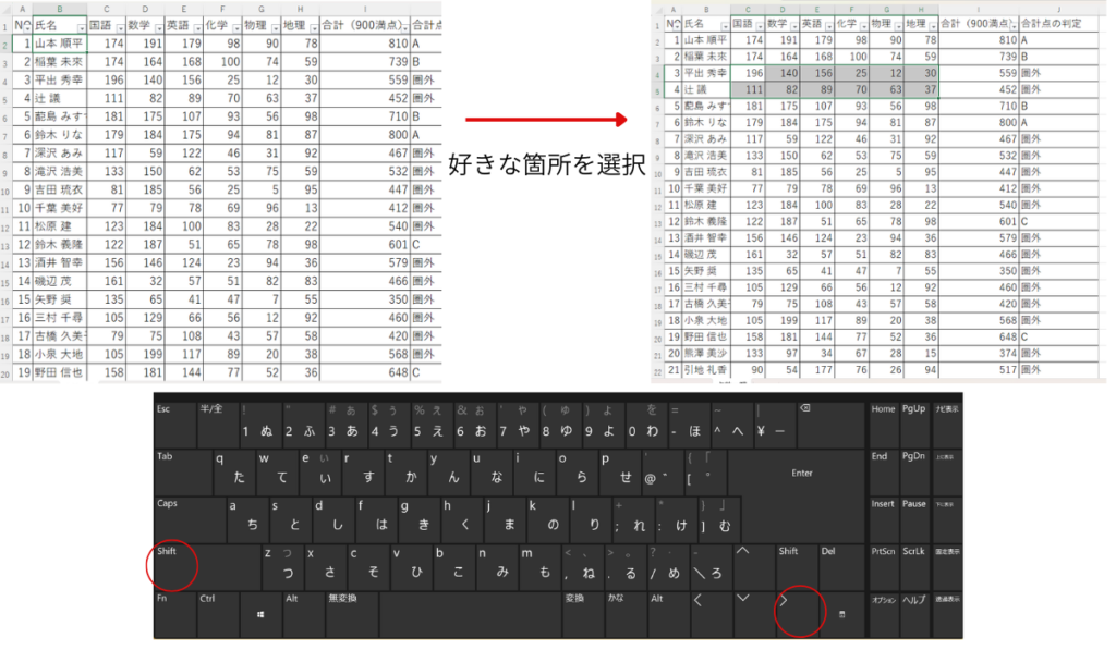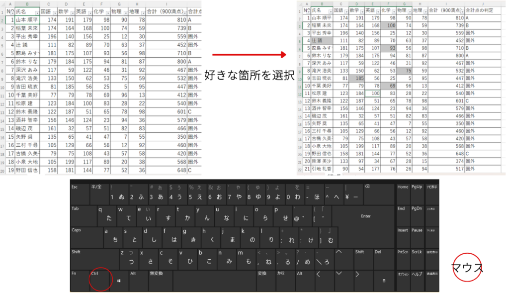 マウスも併用:バラバラなセルをまとめて選ぶ(Shift / Ctrl + クリック)
