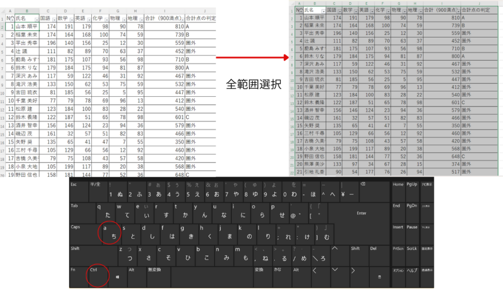 - 効果: 選択しているセル周辺の表全体を、一瞬で選択します。