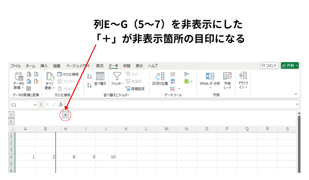 グループ化をすると、非表示箇所に「+」ボタンが追加され、発見しやすくなります。