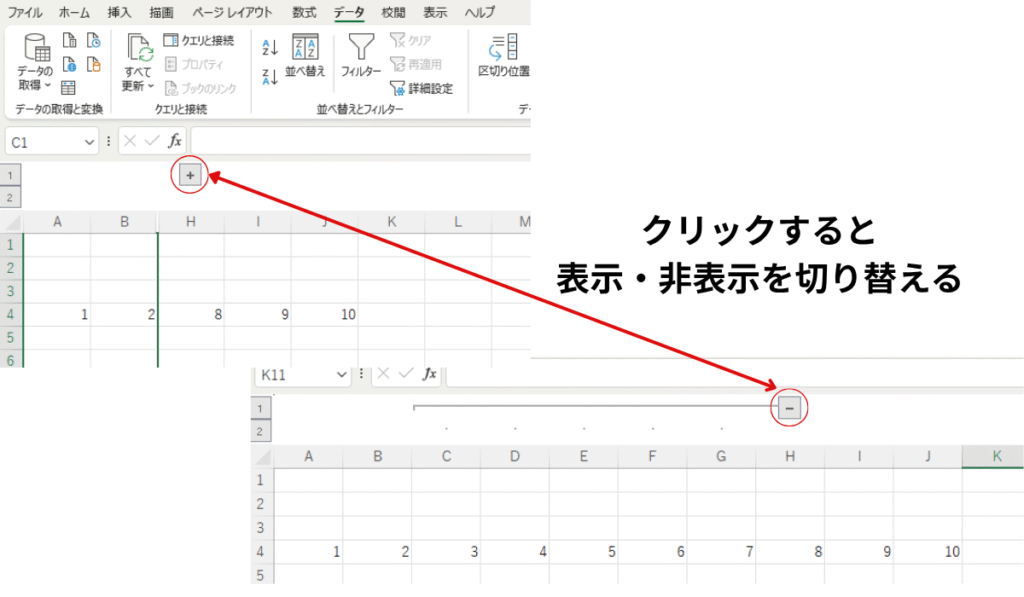 そこでグループ化を利用すると、非表示箇所が明確・ボタン1つで表示・非表示を切り替え可能になります。