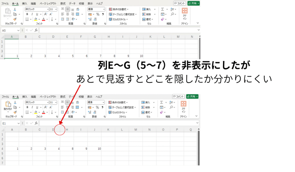 - 行や列を非表示にしたら、どこを隠したか分かりにくくなった
