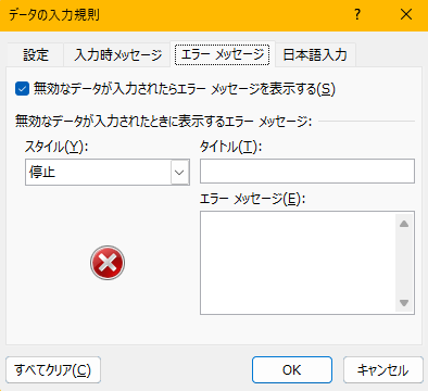 例えば、整数しか入力できないセルを設定した場合、文字や小数を入力するとエラーが発生します。