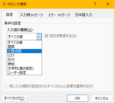 入力規則設定セルを選択 → 入力規則を「すべての値」に変更