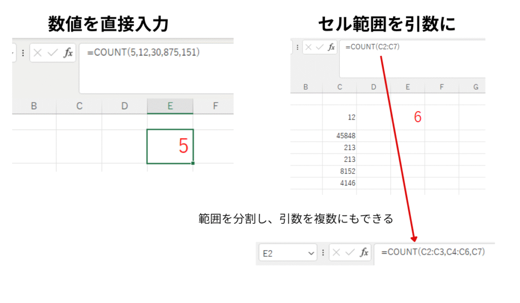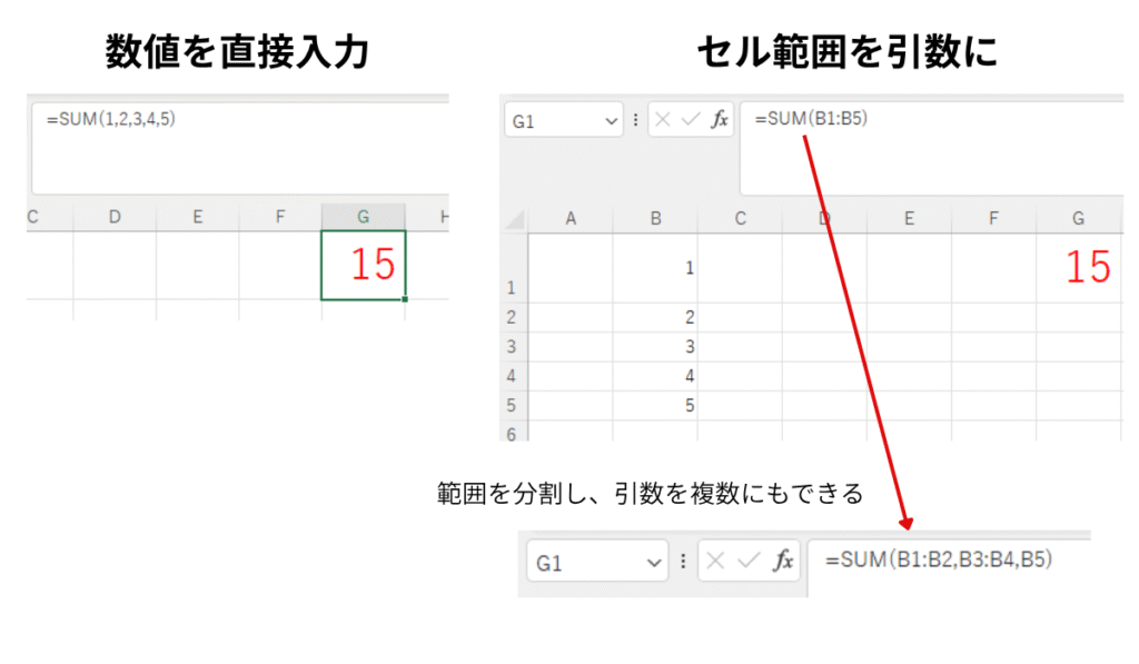 SUM関数と同様に、引数は数値であれば何でも良く、「,(カンマ)」で複数入力可能です。