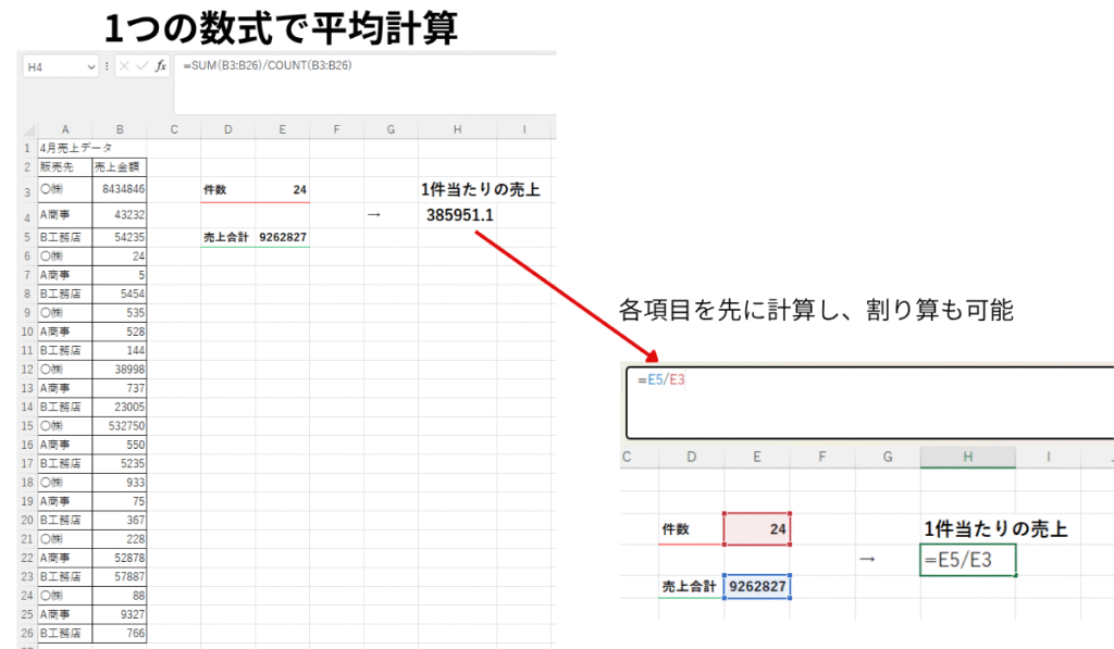SUM関数とCOUNT関数を1個の数式に組み込む例が左側です。