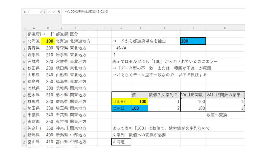 以上より、数式を「 = VLOOKUP( VALUE( J2 ) , B:C , 2 ,0 )」へと修正することで、検索値のデータ型を変更できます。