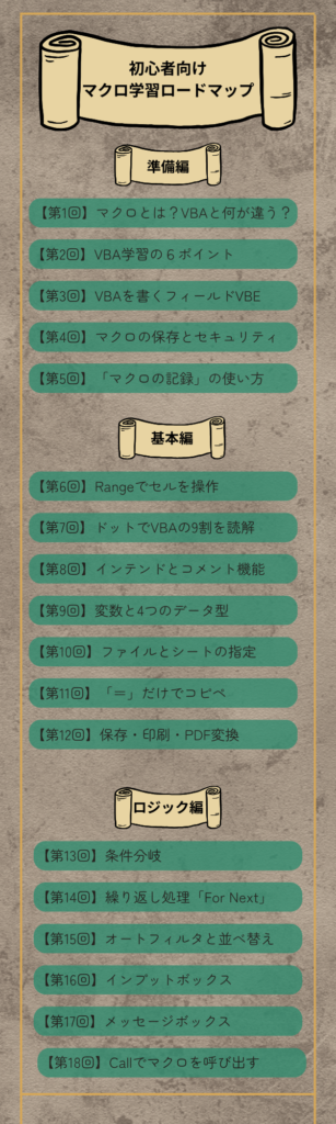ほかのVBA学習ポイントを知りたい方はこちらをチェックしてください。