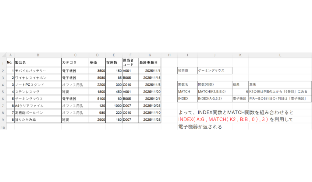 INDEX関数とMATCH関数は、それぞれ単体でも使えますが、組み合わせて使うことでVLOOKUPの弱点をすべて克服できます。