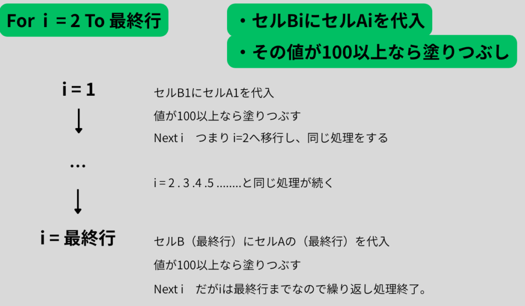 iをRange("A" & i)の行番号として使うのがマクロの基本。 For Nextを使う前に、End(xlUp).Rowで最終行を必ず取得すること。- 大量処理の際は、