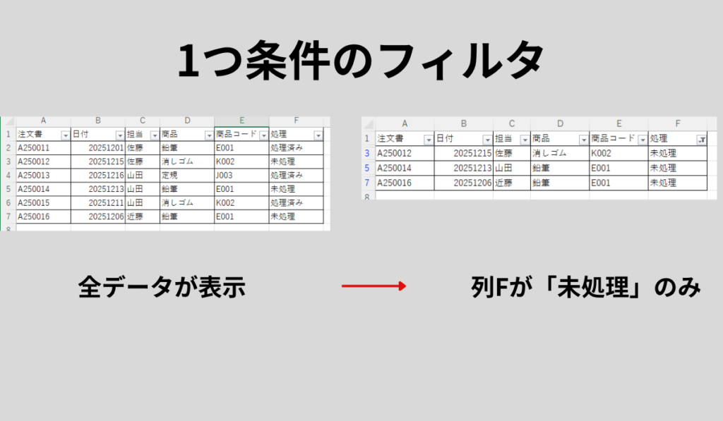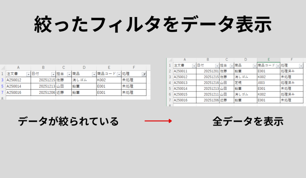 この命令は、現在かかっている絞り込み条件をリセットし、非表示になっている行をすべて表示します。フィルタボタン(▼)はシートに残ったままなので、すぐに次のフィルタをかけることができます。