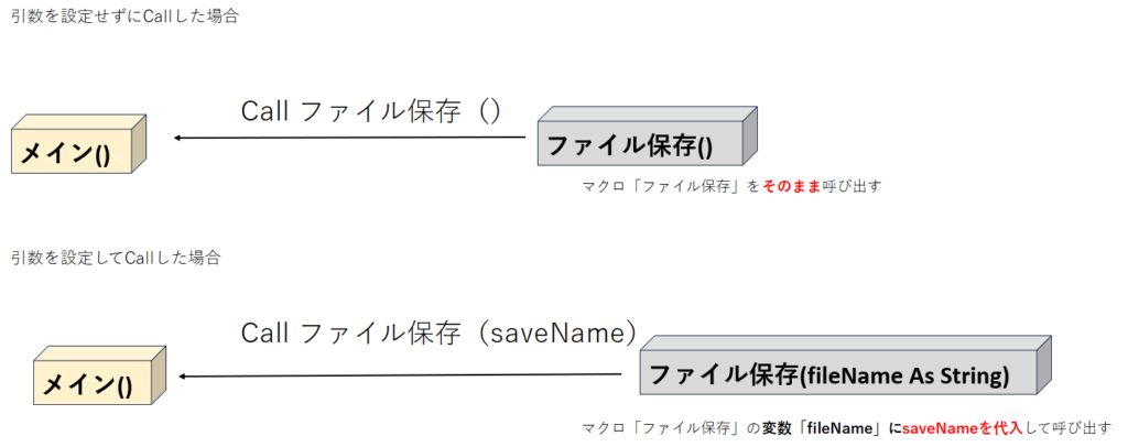 ファイル保存という Subプロシージャを呼び出せ。ただし、saveNameという名前の変数の値を、引数として渡す。 Sub ファイル保存(fileName As String): ここで受け取るfileNameは、この Sub の中で変数として利用できるSubプロシージャ内の変数として定義しています。